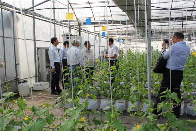 钱春桃副院长首先向各位离退休老干部介绍了研究院成立背景及发展概况。随后干部介绍了研究院开展的技术公益服务等,并着重介绍了研究院正在开展实施的项目——国家重大农技推广服务试点工作项目(简称重大农推项目)背景及实施情况,包括重大农推项目推广示范的新品种——南京农业大学自主培育的水果黄瓜品种‘南水2号’、‘南水3号’,科润黄瓜研究所选育的密刺黄瓜‘津优35号’等,同时介绍了重大农推项目推广示范的新技术,包括嫁接栽培技术、套袋技术、水肥一体化技术、病害物理防治技术(喷施糖醋液等)、网架栽培技术等,相关技术的应用可以提升黄瓜品质,各位老干部随即现场品尝了水果黄瓜,表示口感极佳。钱春桃随后带大家随后来到无土栽培联栋温室,介绍无土栽培不同的栽培方式,包括桶式栽培、袋式栽培、槽式栽培,及每种栽培方式的优缺点。