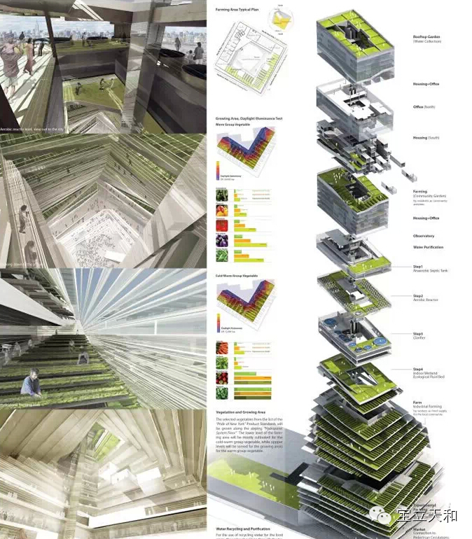 植入居住和商业用途的建筑结合生态耕作。循环利用和减少运输是最终目标。办公与居住输出的生活用水将会从顶层逐层过滤和循环使用。同时考虑如何最大程度地利用自然通风和照明,来减少能量的消耗。