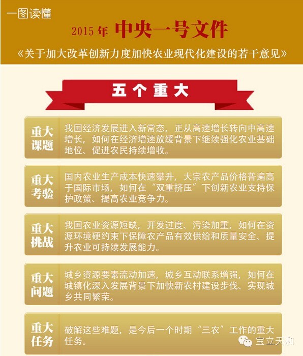 当前,我国经济发展进入新常态,正从高速增长转向中高速增长,如何在经济增速放缓背景下继续强化农业基础地位、促进农民持续增收,是必须破解的一个重大课题。国内农业生产成本快速攀升,大宗农产品价格普遍高于国际市场,如何在“双重挤压”下创新农业支持保护政策、提高农业竞争力,是必须面对的一个重大考验。我国农业资源短缺,开发过度、污染加重,如何在资源环境硬约束下保障农产品有效供给和质量安全、提升农业可持续发展能力,是必须应对的一个重大挑战。城乡资源要素流动加速,城乡互动联系增强,如何在城镇化深入发展背景下加快新农村建设步伐、实现城乡共同繁荣,是必须解决好的一个重大问题。破解这些难题,是今后一个时期“三农”工作的重大任务。必须始终坚持把解决好“三农”问题作为全党工作的重中之重,靠改革添动力,以法治作保障,加快推进中国特色农业现代化。