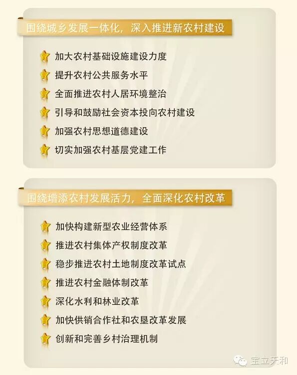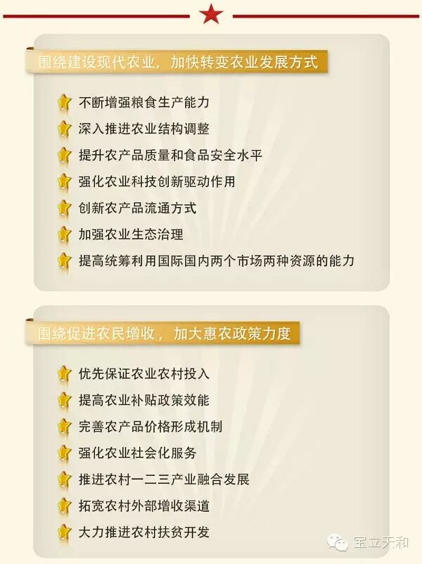 2015年,农业农村工作要全面贯彻落实党的十八大和十八届三中、四中全会精神,以邓小平理论、“三个代表”重要思想、科学发展观为指导,深入贯彻习近平总书记系列重要讲话精神,主动适应经济发展新常态,按照稳粮增收、提质增效、创新驱动的总要求,继续全面深化农村改革,全面推进农村法治建设,推动新型工业化、信息化、城镇化和农业现代化同步发展,努力在提高粮食生产能力上挖掘新潜力,在优化农业结构上开辟新途径,在转变农业发展方式上寻求新突破,在促进农民增收上获得新成效,在建设新农村上迈出新步伐,为经济社会持续健康发展提供有力支撑。